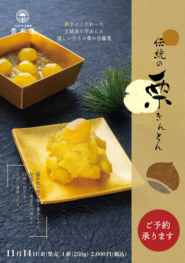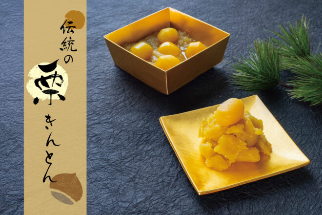 今年収穫した新芋の国産紅あずまを使った青木屋自慢の栗きんとんです。栗の甘露煮を贅沢に乗せて、新年の始まりに華やかな彩を