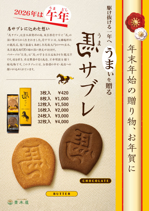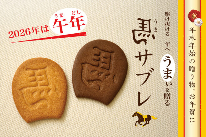 2026年は午年(うまどし)です。年末年始の贈り物、お年賀に縁起の良い左馬の”馬サブレ”を是非ご利用ください。