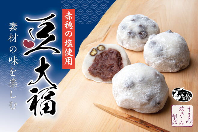 歯ごたえを残した豆を柔らかい大福生地に入れ、赤穂の塩で