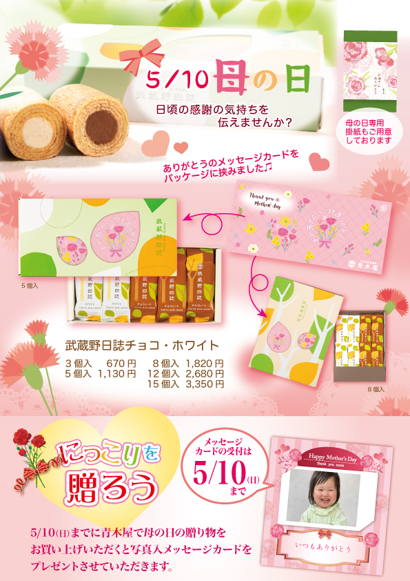 ※5/10(日)までに青木屋で母の日の贈り物をお買い上げいただくと写真入りメッセージカードをプレゼントさせていただきます。