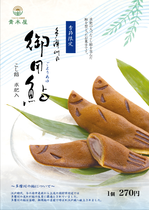 求肥の入ったこし餡を包んだ、鮎を型どったお菓子です。